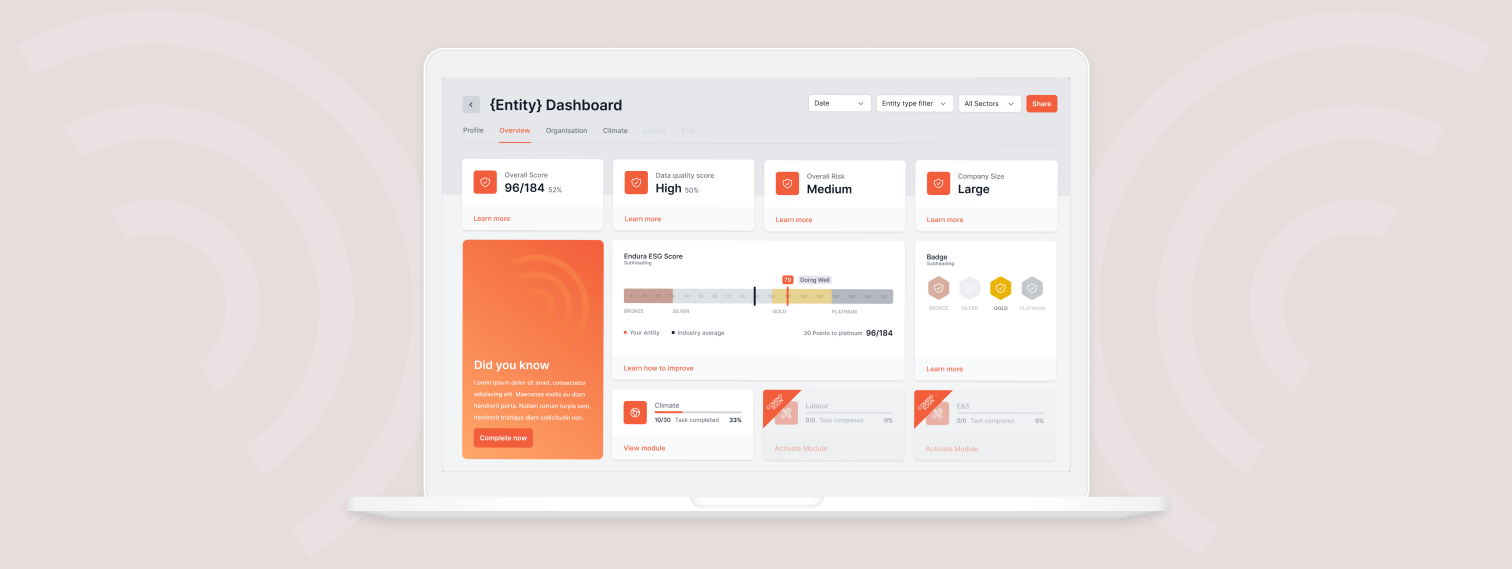 We understand the growing importance of your sustainability data and how to navigate business risk and opportunities. Our innovative tool provides companies like yours with the means to easily measure, track and improve your sustainability performance, paving the way for enhanced credibility, stakeholder engagement, and value creation. The Endura platform is your one-stop portal to measure, track and improve your ESG rating: